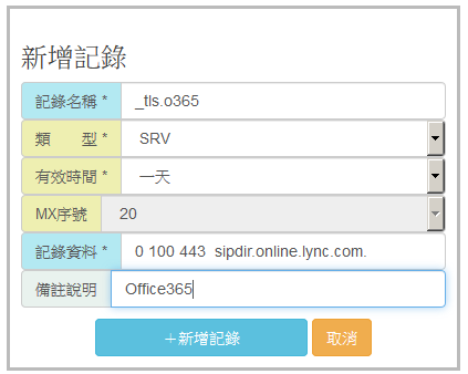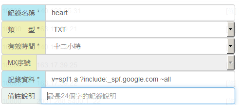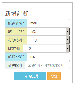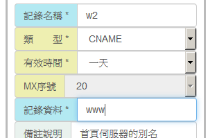 其中上面綠色的部分已經是管理的網域,所以只需要填入非綠字的部分即可,最後一個點 '.' 請勿填入。