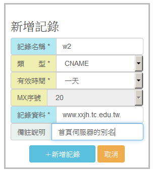 2. 完整的網域名稱中要注意請不要漏掉網域最後面的點 '.',這代表從根開始寫的完整紀錄。以上範例會把 w2.xxjh.tc.edu.tw 設為 www.xxjh.tc.edu.tw 的別名。