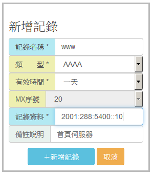1. AAAA紀錄是IPv6的位址紀錄,紀錄資料是一個合法的IPv6位址,如果位址不合法,系統執行時不會寫入成功,可使用查詢功能來確認。